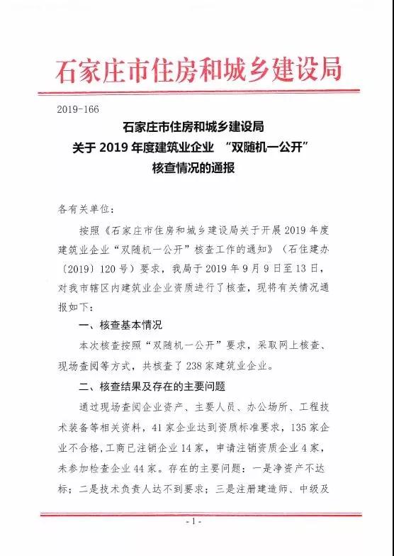本次共核查了238家建筑業企業,其中,41家達到資質標準要求,197家不合格(含工商已注銷企業14家,申請注銷資質企業4家,未參加檢查企業44家)。